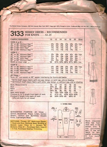 Web Vintage knit fabric dress with slit at front neckline and patch pockets sewing pattern from 1972. 43 15 1061 1212.